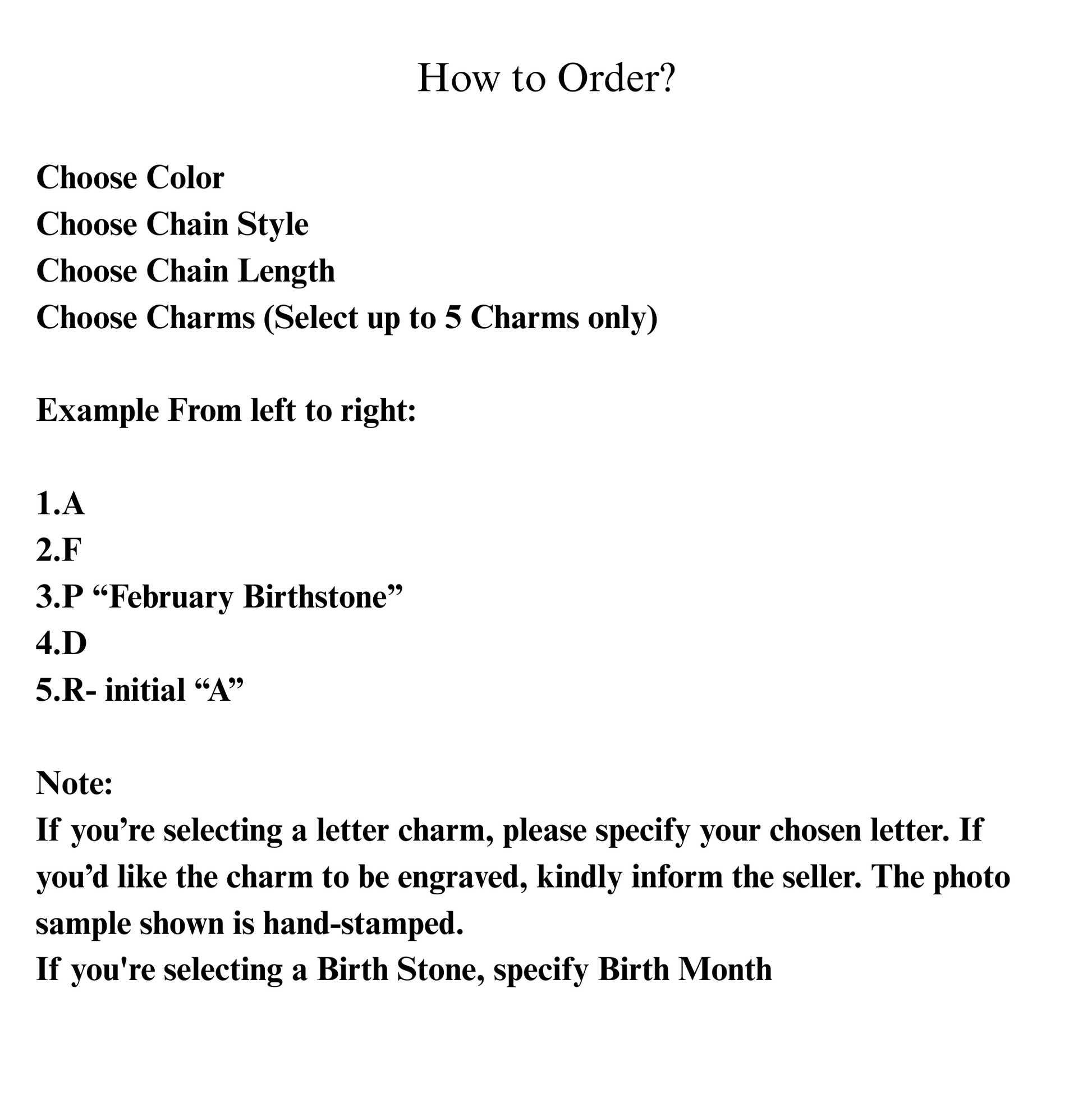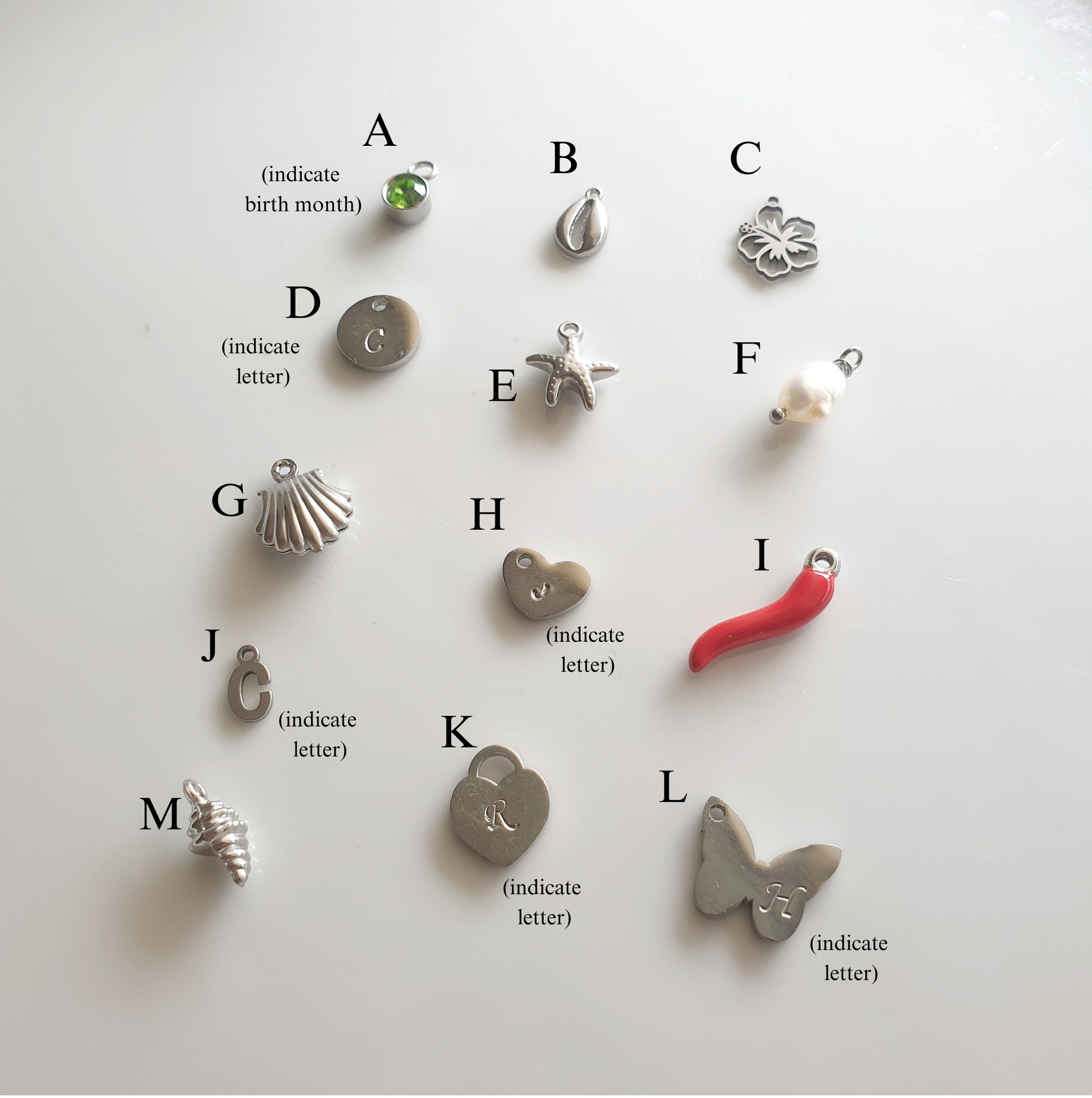 If you’re selecting a letter charm, please specify your chosen letter. If you’d like the charm to be engraved, kindly inform the seller. The photo sample shown is hand-stamped.